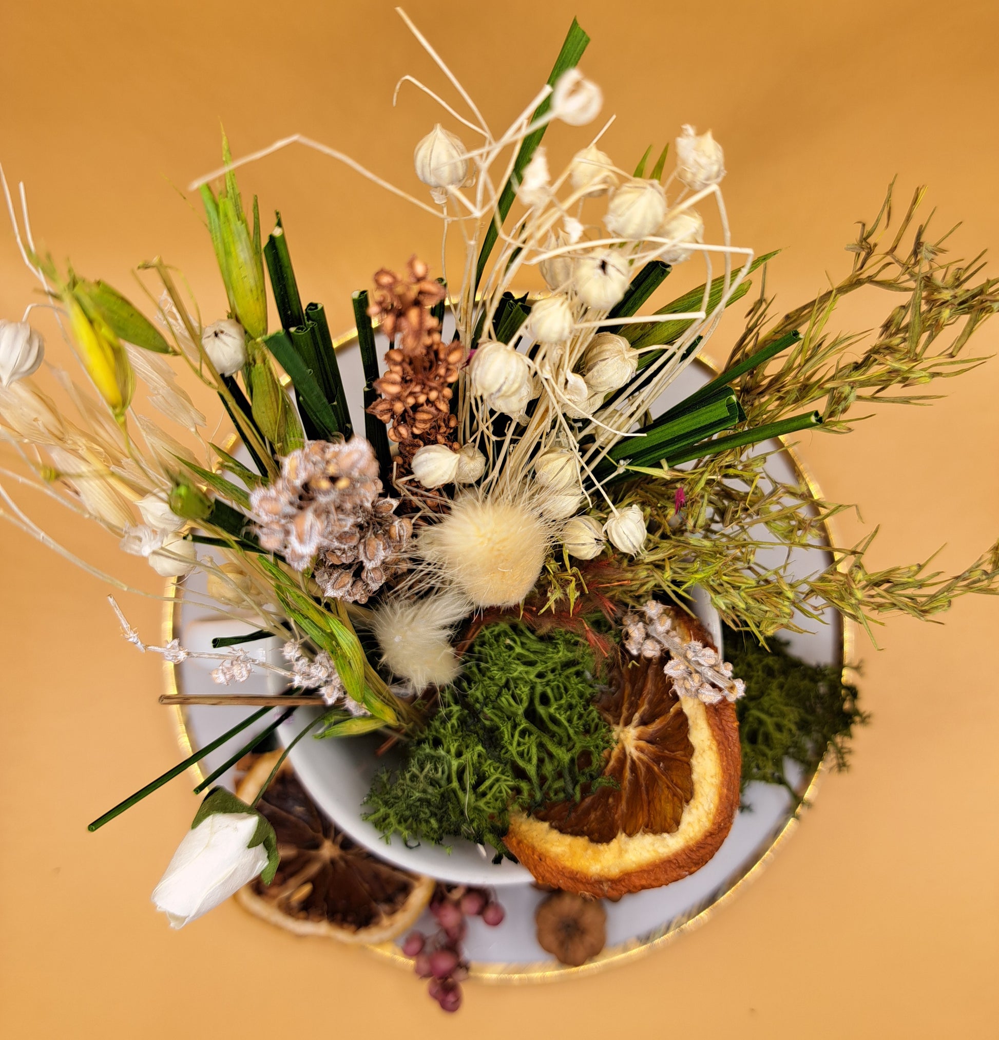 The perfect whimsical cup for those who love wandering through meadows! Decorated with a selection of dried flowers, orange and lemon slices, a cinnamon stick and a sprinkling of pumpkins (putka pods), the Moira cup is an autumnal favourite.